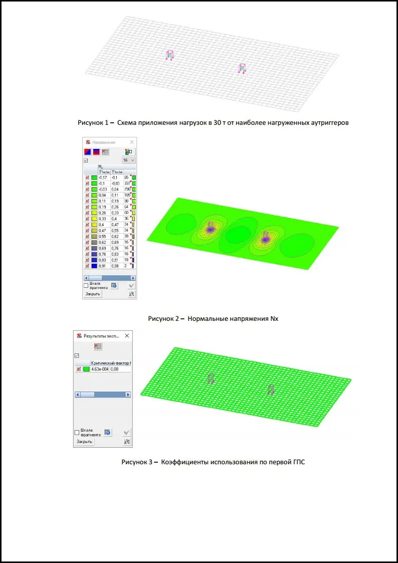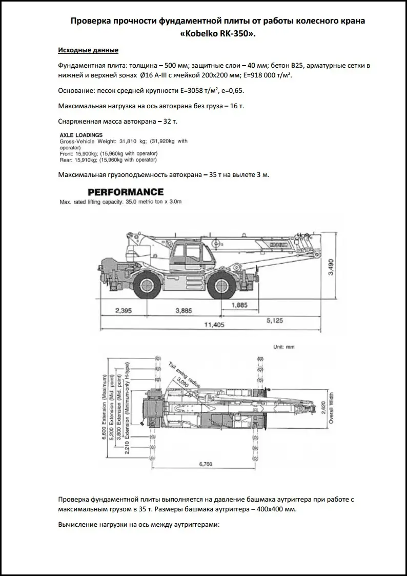 Продолжаем тему расчетов. На этот раз в составе ППРк. В связи со стесненными условиями производства работ, а также ограничением возможностей по выбору грузоподъемной техники было принято регшение о том, что перемещение карна будет осуществляться непосредстенно по поверхности фундаментной плиты, на что нашими специалистами был сделан соответствующий расчет. Данный расчет подтвердил, что фундаментная плита имеет возможность принимать на себя нагрузку от колес работающего крана и имеет запас прочности.