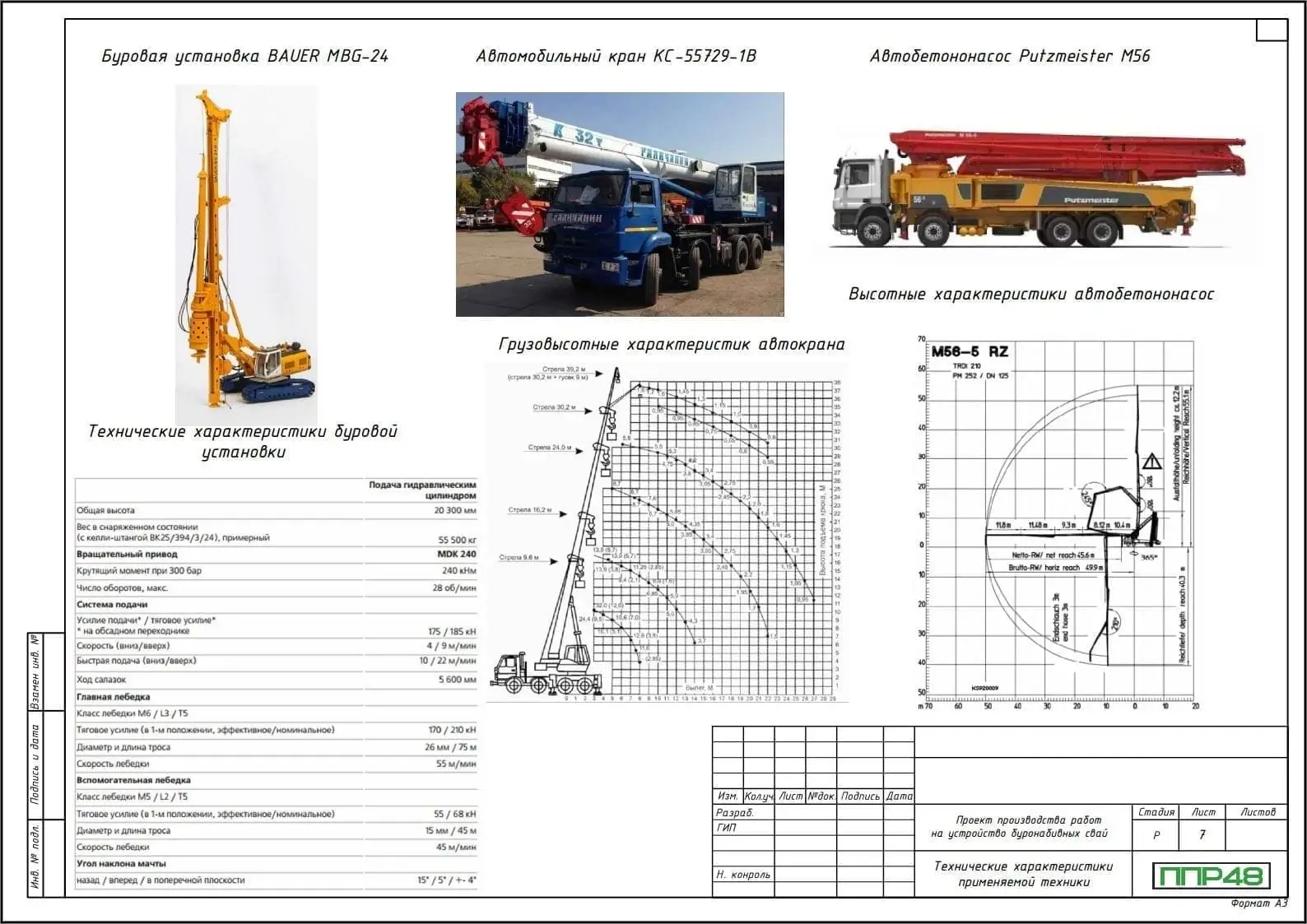 - Перечень и характеристики строительной техники (сваебойные установки, буровые машины, краны, компрессоры и др.);