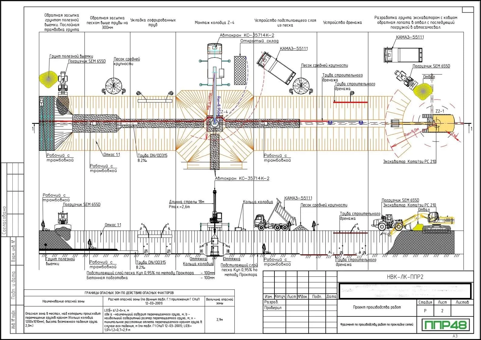 Раздел на выполнение земляных работ является неотъемлемой частью данного типа документа. При открытой прокладке НВ, перед укладкой трубопроводов, выполняют отрывку грунта траншеи. Если траншею разрабатывают в стесненных условиях, в слабых грунтах и при глубине разработки от 2 метров и более, то стены откосов крепят с помощью деревянных досок или шпунтового ограждения. На следующем строители укладывают петли трубопроводов, выполняют обратную засыпку и уплотнение.
